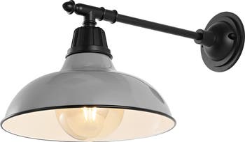 - This two-tone wall light has a black straight bracket and a wide metal shade in classic gray and white
