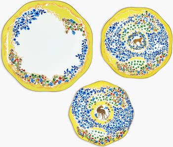 This s et of bone china three-piece plates with a yellow garden design was inspired by a backyard garden on a sunny afternoon, with scattered blue floral patterns set against the yellow sunlight. The plates are embellished with animals, showcasing the harmony between humans and nature. Bright gold banding looks fantastic and provides superior strength.Starters, sides, or sweets, true luxury is about following your intuition. Rich in color, print and personality, this design will spark your imagination and add a pop of inspiring color and bold pattern to your table. Presented in our signature JZ gift box.