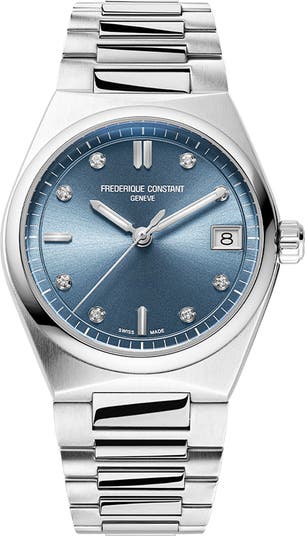 Precision quartz movement highlights the impeccable Swiss craftsmanship of this timepiece detailed with eight glittering diamonds and fitted with a mixed-texture bracelet composed of contrasting brushed and polished links.