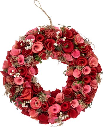 Display a unique expression of affection with this wood shaving roses artificial wreath. Crafted with delicate pink and red wood shaving roses, this Valentine's Day wreath offers charming and handcrafted aesthetics for seasonal décor. The lightweight wood shavings are shaped into realistic-looking blooms, providing a distinctive alternative to traditional floral wreaths. Its design creates a visually appealing centerpiece for doors, walls, or mantelpieces during the Valentine's season. The combination of romantic pink and passionate red hues conveys a warm and loving sentiment. Durable artificial materials ensure lasting beauty, allowing for repeated seasonal use. Make this wreath a centerpiece to create a welcoming and romantic atmosphere in your home. The unique texture of the wood shavings adds an artisanal quality to your Valentine's Day decorations. This artificial wreath offers a distinctive and heartfelt decorative accent. Use this wreath as a charming way to express love during the Valentine's season. Product Features: Wooden Valentine's day wreath Features wood shaving pink and red roses Accented with white berries and mixed foliage Comes ready to hang on a jute cord Flat foam backing No assembly required - wreath comes in 1 piece Recommended for indoor use - if using outdoors place under a covered area Dimensions: 12.25" diameter (measured from outermost edge to outermost edge across the wreath) Material(s): wood/foam/jute