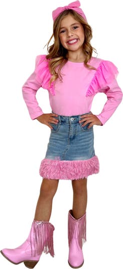 Adorable pink ruffle top and denim skirt set for a trendy and stylish look. Soft, comfortable fabric ensures all-day comfort and ease of movement. Stylish long sleeve top with tulle ruffle shoulder details for added flair.