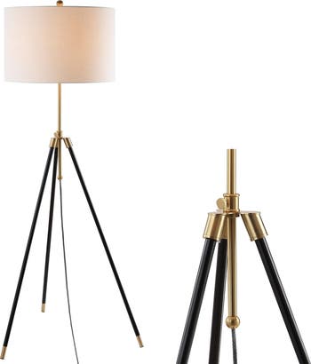 This tall, trim, tapered tripod takes a stand in warm brass and glossy black, topped by a crisp white cotton drum shade that adds a classic note to the modern sculpture feel. A drop-down cord wrapped in silk boasts a step-on switch for illuminating its replaceable LED bulb. With the top third of the base adjustable in height, you can properly scale it to sit behind any height sofa or chair.