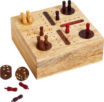 Pachisi is an age old Indian classic game now enjoyed around the world! Handcrafted from sustainably harvested mango wood, the box features a hinged lid that doubles as a game board and storage box for the game peg pieces.
