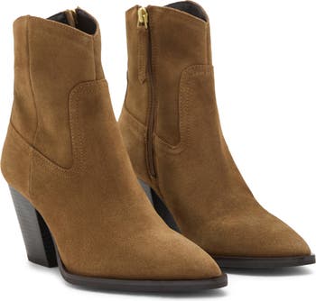 A pointed toe and angular heel perfect the Western style of this suede bootie that will elevate any look.