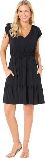 Effortlessly chic and ready for any getaway. This wrinkle-resistant short dress combines carefree comfort with polished style. A V-neckline and blouson shape flatter every figure, while adjustable shoulder ties let you customize your fit. The elasticized waist defines your silhouette, and side seam pockets add practical ease. Finished with a softly shirred ruffle hem for a feminine touch that moves beautifully wherever you go.