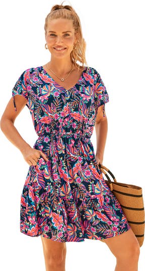 Effortlessly chic and ready for any getaway. This wrinkle-resistant short dress combines carefree comfort with polished style. A V-neckline and blouson shape flatter every figure, while adjustable shoulder ties let you customize your fit. The elasticized waist defines your silhouette, and side seam pockets add practical ease. Finished with a softly shirred ruffle hem for a feminine touch that moves beautifully wherever you go.