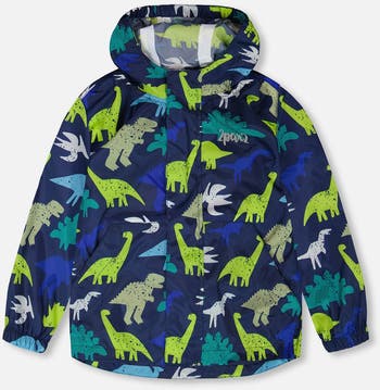 Our packable polyester windbreaker in blue with dinosaur print brings adventure-ready style to rainy days. Made with an eco-friendly BIONIC-FINISH® ECO coating and a 10,000 mm waterproof layer, this windbreaker keeps boys dry and comfortable while exploring outdoors. With taped seams, reflective bands, and a clever packable pouch design, this lightweight jacket combines fun prints with everyday practicality.
