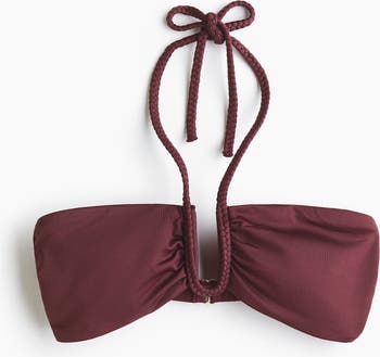 Lined bandeau bikini top featuring cups with removable inserts that shape the bust and provide good support. U-shaped wire detail at the centre of the bust, concealed silicone trim at the top and braided halterneck ties. Side support and adjustable hook fastening at the back.
