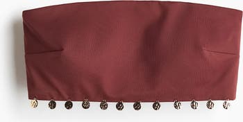 Lined bandeau bikini top featuring cups with removable inserts that shape the bust and provide good support. Concealed silicone trim at the top, and side support. No fasteners.