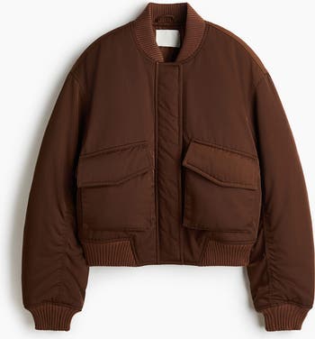 Padded bomber jacket in woven fabric with a ribbed stand collar, zip and wind flap with concealed press-studs down the front. Patch front pockets with a flap, concealed press-stud and handwarmer pockets underneath. Dropped shoulders and ribbing at the cuffs and hem. Lined.