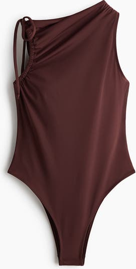Fully lined swimsuit with one wide shoulder strap and one tie-top shoulder strap that functions as a drawstring at the front to create an asymmetric, draped effect. Cups with removable inserts that shape the bust and provide good support. High-cut legs and cutaway coverage at the back.