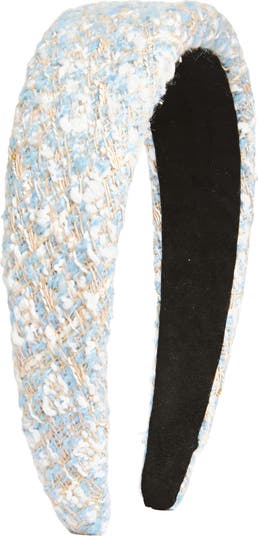 Transform your tresses into a chic statement with this padded headband fashioned from preppy tweed winked with twinkling metallic threads.
