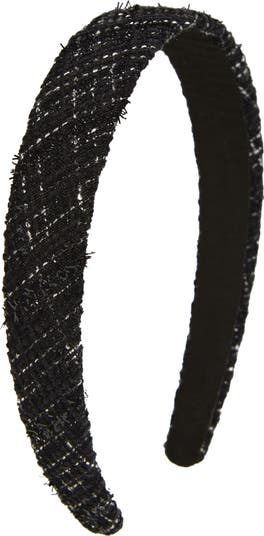 Transform your tresses into a chic statement with this padded headband fashioned from preppy tweed winked with twinkling metallic threads.