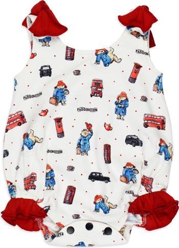Contrasting ruffles at the leg openings and ties at the shoulders add to the sweet look of this Paddington Bear bodysuit made from supersoft organic cotton.