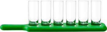 Serve vodka, tequila and other spirits with this set of six shot glasses that nestle securely along the length of a color-popped ash board.