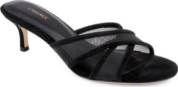 Supple suede trims highlight the airy mesh straps on an elegant slide sandal set on a foam-cushioned footbed and modest heel.