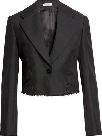 Emblematic of the spring '26 theme of restraint vs. release, this runway-featured cropped jacket is both tailored and transgressive in wool and mohair hopsack that gives the piece a polished look from the frayed hem, upward.