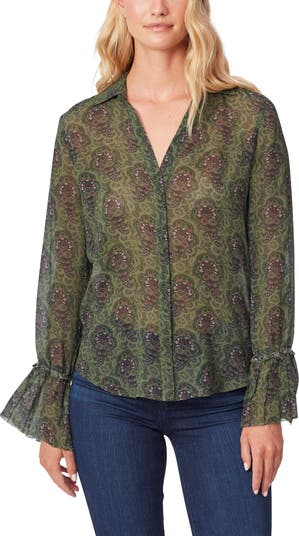 A vintage-inspired floral pattern adds moody appeal to this semisheer silk top complete with ruffled cuffs.