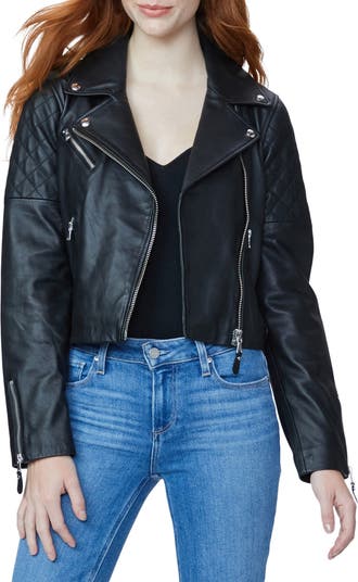 Crafted from smooth lambskin leather, this moto jacket with zippered cuffs gets its laid-back vibe from the diamond quilt pattern at the hem and shoulders.