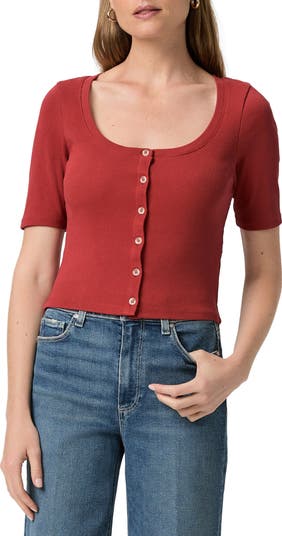 Opt for a vintage look in this short-sleeve button-up sweater knit in a fine-gauge from stretch-cotton yarns.
