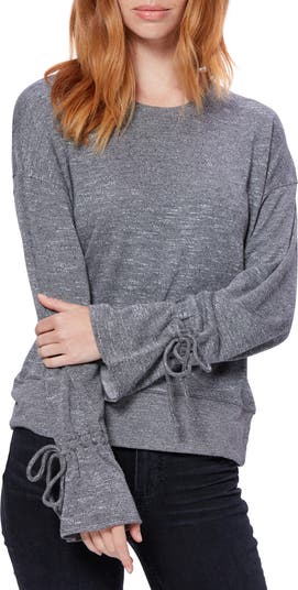 Style up your comfort look in this butter-soft knit top cut with a crewneck and tie-cinched flared cuffs.