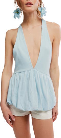 A fluttery peplum and vibrant hue add dreamy allure to this halter top cut in a sleeveless and backless silhouette that complements your resort-ready look.