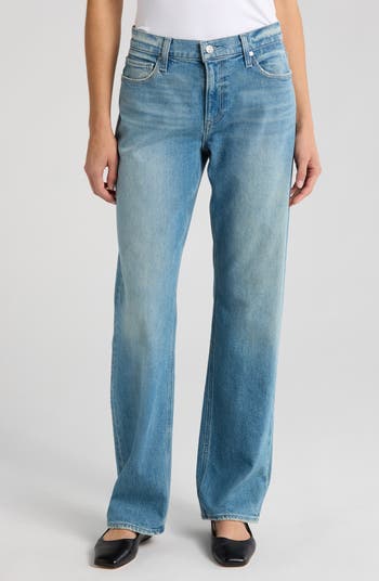 Relaxed straight legs and a slightly slouchy waistline create a laid-back look in full-length boyfriend jeans made with a slight green tint for a vintage vibe.