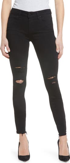 Ripped, shredded and lightly distressed, these faded, black skinny jeans add a little rocker-chic edge to your everyday look.