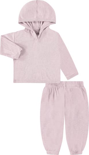 This pullover hoodie-and-pants set is made from soft, overdyed jersey to keep baby comfy and coordinated.