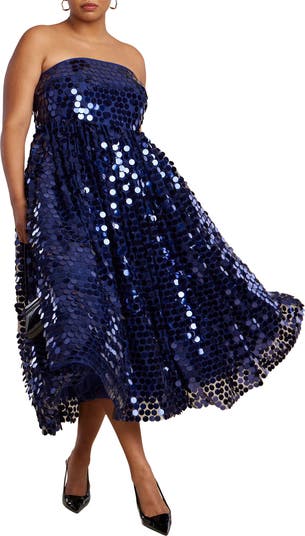 A celebration of sparkle, volume, & glamour, this head-turning strapless dress pairs a sculpting bodice with a crinoline-lined skirt that sways with every step. It was intentionally covered in sparkly paillettes to light up any dance floor, cocktail hour, or NYE bash.