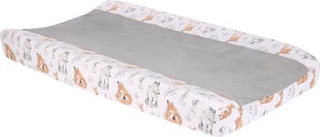 A soft gray furry minky center is perfect for changing your little one. The side panels are a pretty watercolor 100% cotton print of our favorite woodland animals including foxes, bunnies, bears, deer and foliage. There are buttonholes for the changing pad straps so your little one is safe and secure while getting their diaper changed.