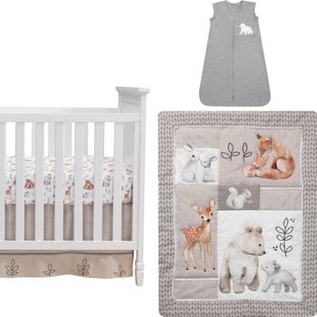 - The four-piece crib bedding set includes one quilt, one 100% cotton fitted crib sheet, one crib skirt and one wearable blanket.