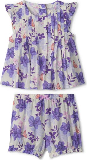This adorable cotton set helps your little one stay cute and comfortable in warm weather with a flutter-sleeve, pleated top matching bloomer-style shorts.