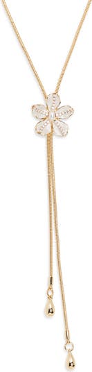 A lustrous faux pearl glows at the center of this painted pansy bolo necklace sprinkled with crystals for enhanced sparkle.