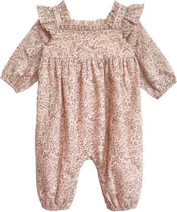 Dress your little one with the Paisley Romper, a blend of playful design and ultimate comfort. Featuring a delicate paisley print in soft pink with muted accents of brown, pink, and cream, this romper is just the cutest! The square neckline adorned with dainty ruffles and elastic cuffs at the wrists and ankles add thoughtful touches. Fabric Content & Care 65% VISCOSE 35% POLYESTER Machine Wash Cold | Line Dry | Do Not Bleach