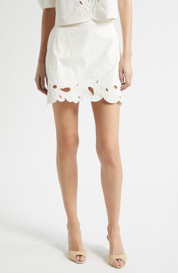 Pretty floral embroidery with petal-like cutouts and a scalloped hem make this cotton miniskirt a must have for the warmer seasons.
