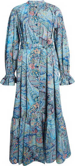 House-signature paisley swirls in kaleidoscopic color across this knotted-waist maxi dress traced with dramatic ruffles at the cuffs and hem.