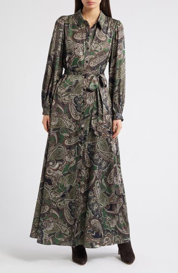 Paisley plays in a pretty way across a classic shirtdress cut to a trend-right maxi length.