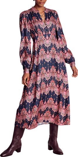 Smocking and gathers enhance the fit and flow of this midi styled with an Empire waist and softly billowed sleeves.