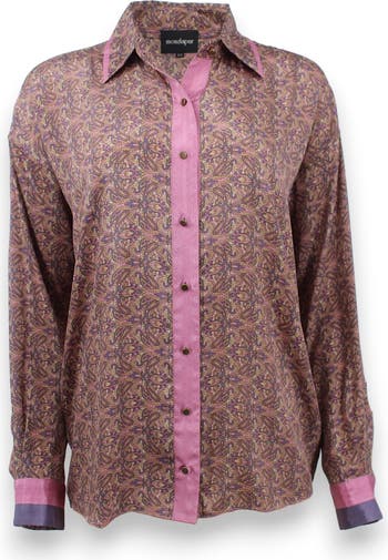 For Kings and Queens. Where retro charm meets sophistication, sportiness, and ease this genderfluid paisley shirt is designed to flow effortlessly through your day. With a silk-like drape and a breathable, fluid fabric, it offers comfort and elegance from brunch to after-dark gatherings. The whimsical yet refined paisley print is available in four dreamy colorways: Mint, Mustard, Rosè, and Lilac. Pair it with our matching paisley stripe pants for a bold, coordinated statement, or wear it solo as a versatile wardrobe hero. Styled buttoned up or worn open over a crop tank, this piece invites self-expression and styling freedom.