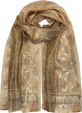 The Paisley Oblong scarf, crafted from a luxurious blend of 67% silk and 33% metallic fiber, exudes elegance and shine. Its intricate paisley pattern adds a timeless, sophisticated touch, while the metallic fibers provide a subtle, eye-catching shimmer. Perfect for adding a refined accent to any outfit, this oblong scarf features a clean machine-hemmed finish, ensuring both durability and style. Ideal for day-to-night wear, it effortlessly elevates your look with a touch of opulence and grace.