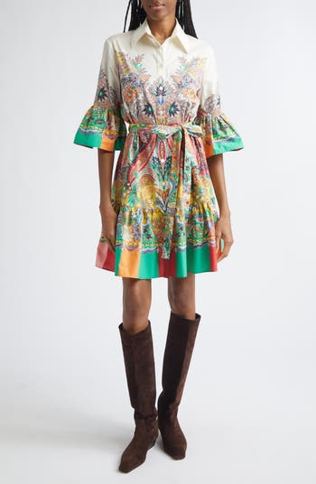 Symmetrically mirrored paisley placed patterning vividly illustrates this belted shirtdress with ruffle-belled cuffs echoing the flared skirt.