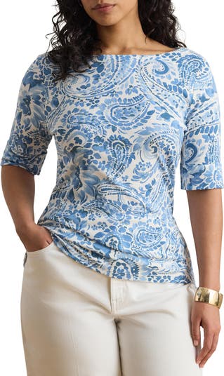A classic paisley pattern blossoms on this lightweight T-shirt fashioned with a classic boat neck and elbow-length sleeves.