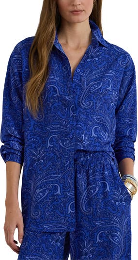 Swirling paisleys cover a flowy button-up shirt rendered in a day-brightening blue hue.