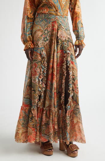 This antique-inspired paisley print on sumptuous silk chiffon brings signature Etro nostalgia to this maxi skirt embellished with frills at the leg-baring front slit and a deep flounce that brings volume to the hemline.