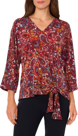 A bright paisley print adds to the appeal of a lightweight top fashioned with a free-spirited tie at the hip.