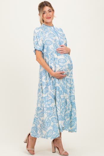 Embrace effortless style and comfort with this paisley print tiered midi dress, designed specifically for maternity wear. Featuring a flattering empire waist that easily accommodates your growing bump, this dress offers a relaxed fit and flowy tiered skirt for ultimate ease. The short puff sleeves with delicate ruffle detailing and a soft round neckline add a feminine touch, making it perfect for both casual outings and special occasions. Crafted from lightweight, breathable fabric, it ensures all-day comfort while keeping you chic throughout your pregnancy journey. Pair with your favorite sandals or heels for a polished look.
