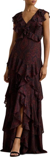 Soft ruffles and tiered layers bring romantic movement to this paisley gown framed by a flattering V-neckline and a cascading skirt finished with an alluring side slit.