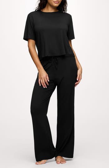 This pajama set keeps things simple and wonderfully indulgent with a short-sleeve T-shirt and matching high-rise pants that move like air. Lightweight, cool and stretchy with a relaxed shape, this set is made for slow mornings and even slower evenings.
