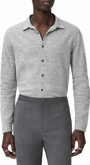 A tactile jacquard of tropical fronds provides rich texture in this knit button-up shirt made from a breathable cotton blend.